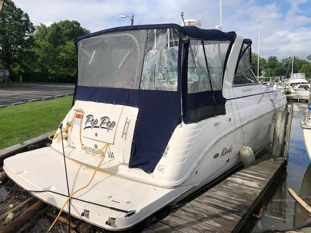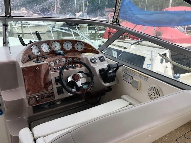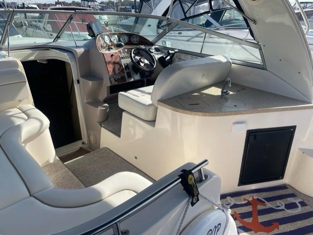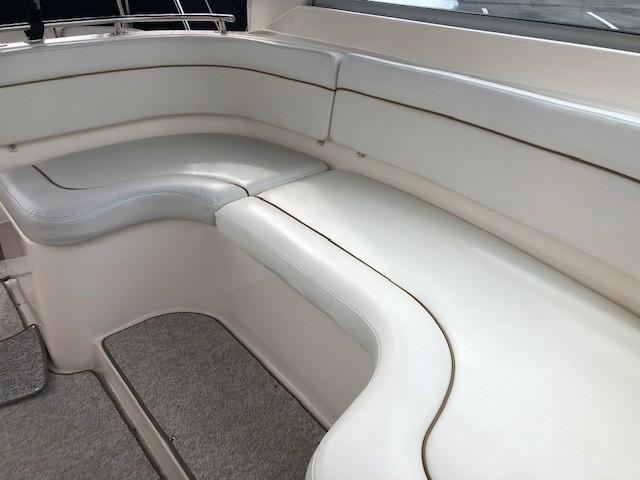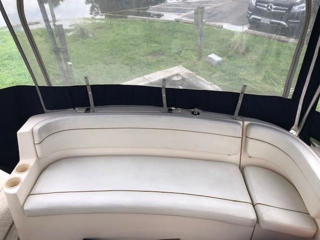 On deck you have a full camper top for those chilly days, well appointed wet bar with fridge and built in blender for your favorite cooled drink. Ample seating for the whole family and friends. At the helm 8 inch color GPS, windlass controls, and a bowthruster.