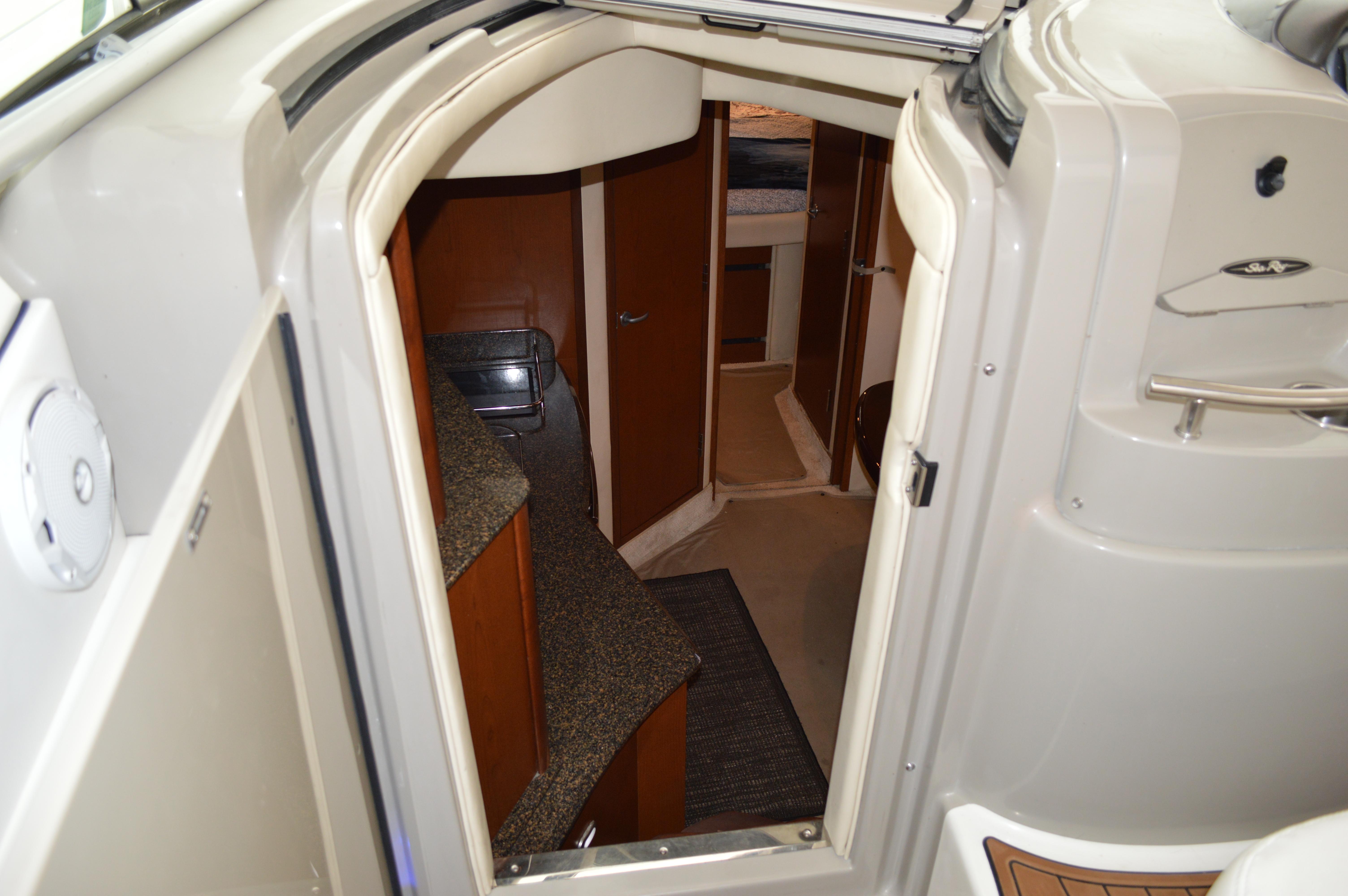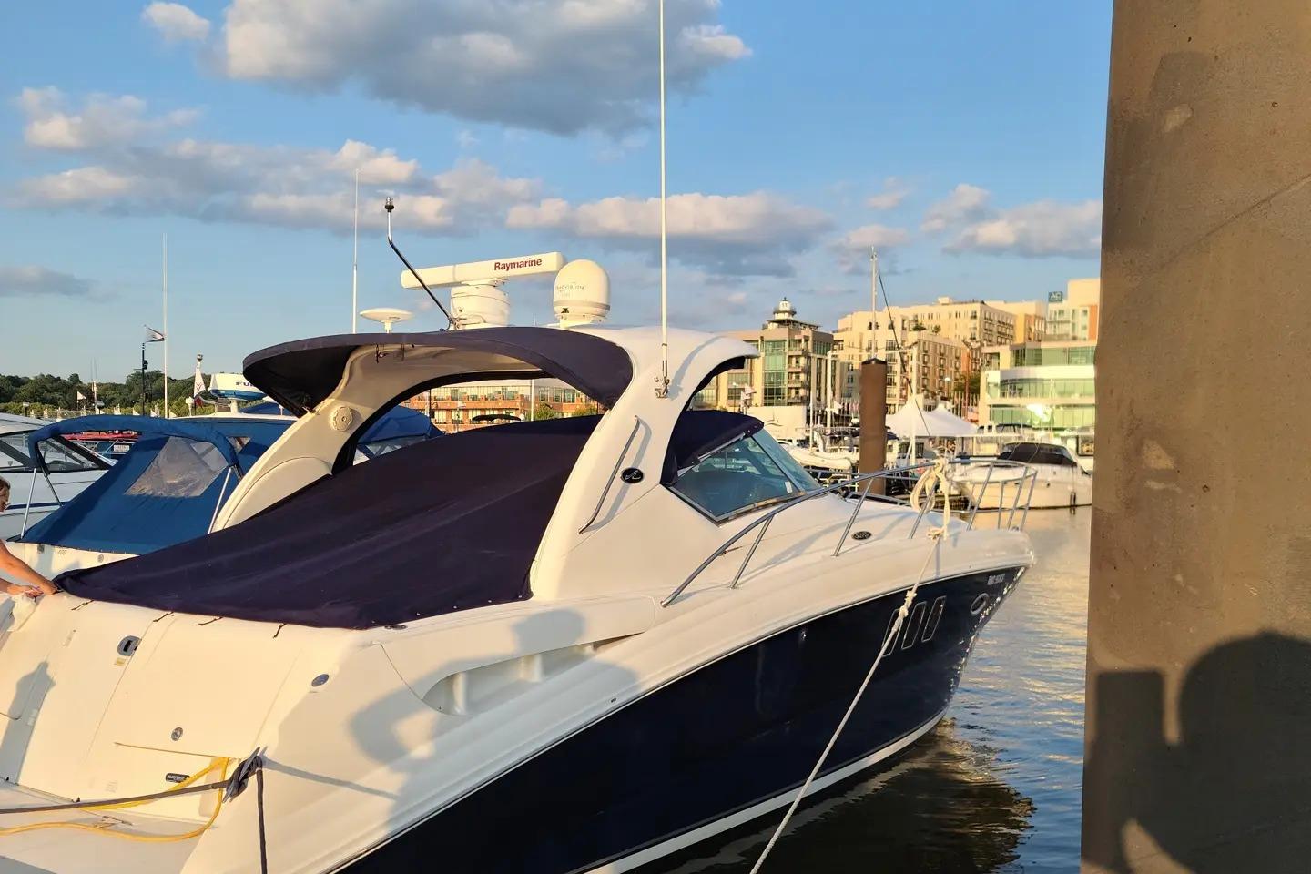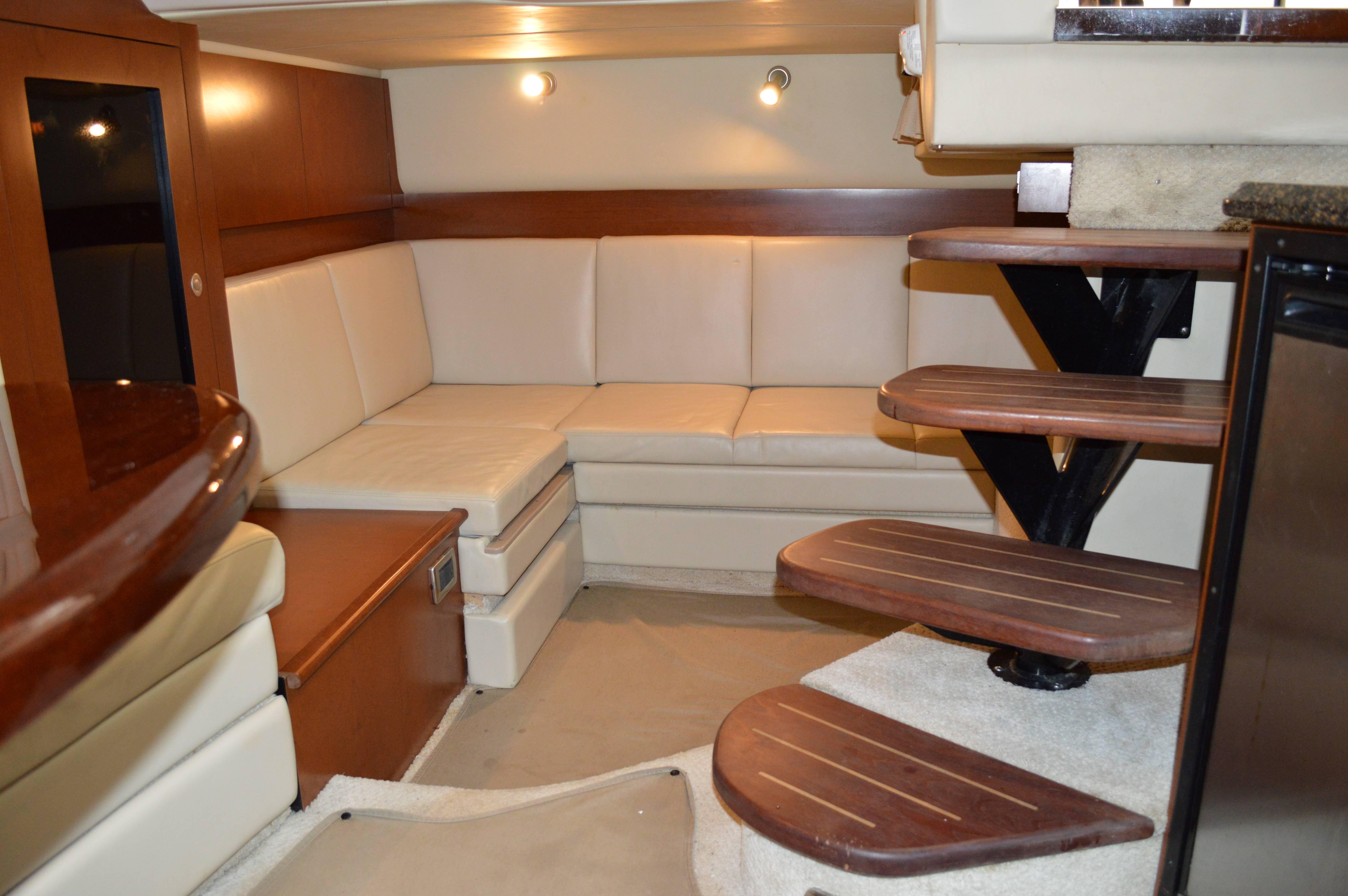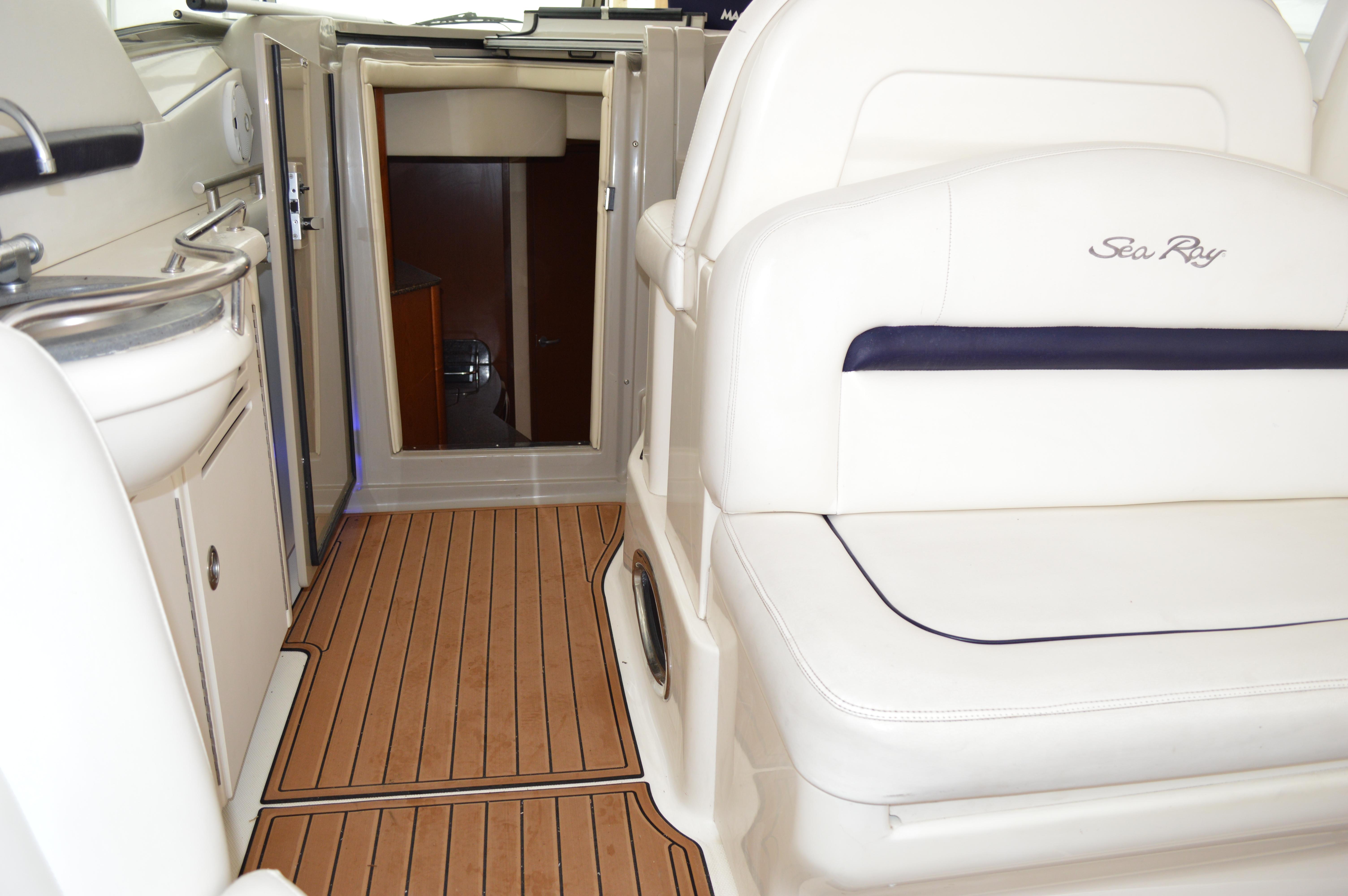 This exciting 38 Sundancer features a stylish fiberglass hardtop with aft sunshade, overhead lighting and stainless-steel grab rails. An innovative center door in the transom provides easy access to the luxuriously appointed cockpit, complete with Corian table top, wet bar and icemaker. Powered by twin 8.1 S Horizon MerCruiser V-drives. This Sport yacht offers underwater exhaust and standard anchor washdown.