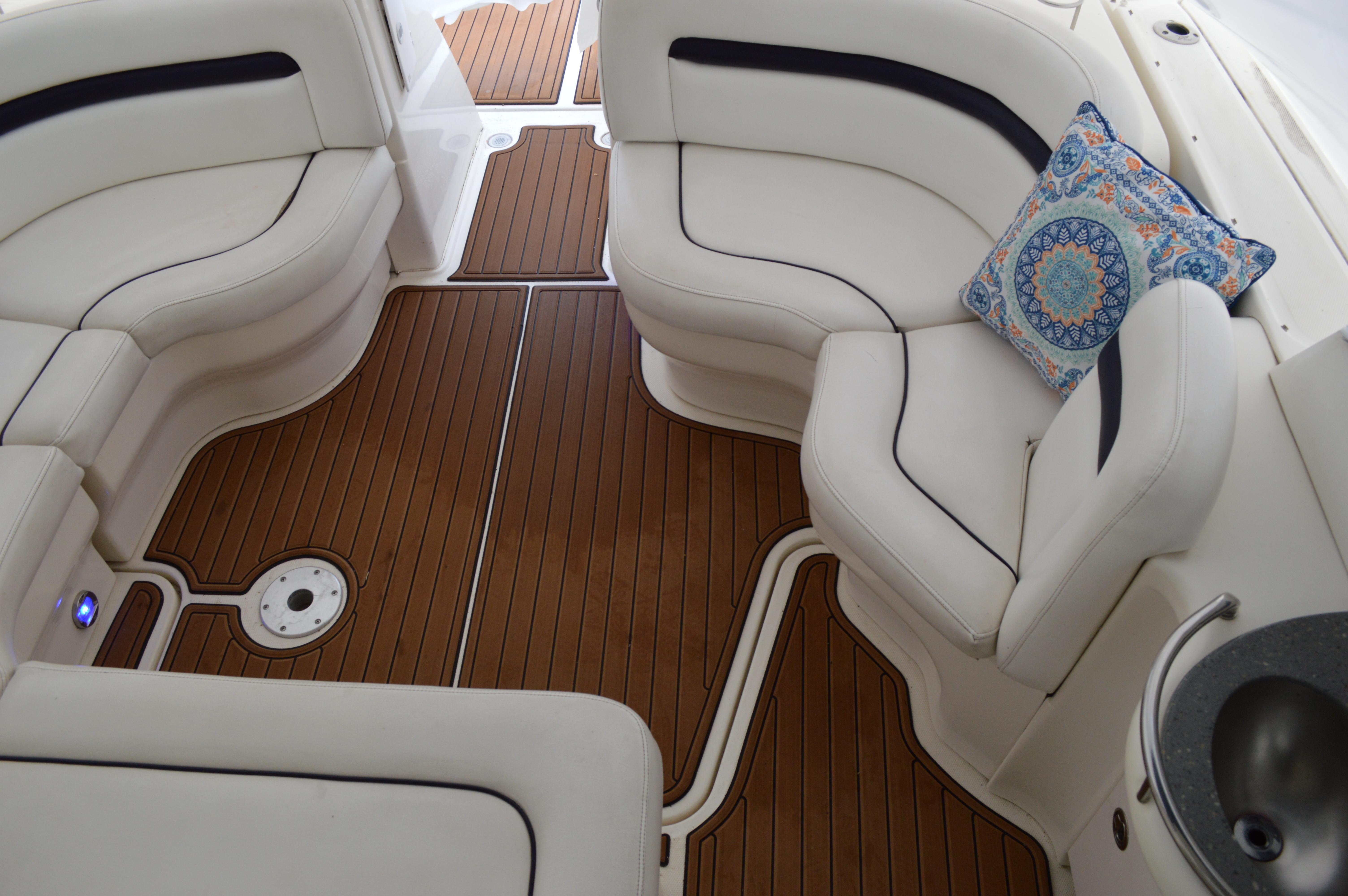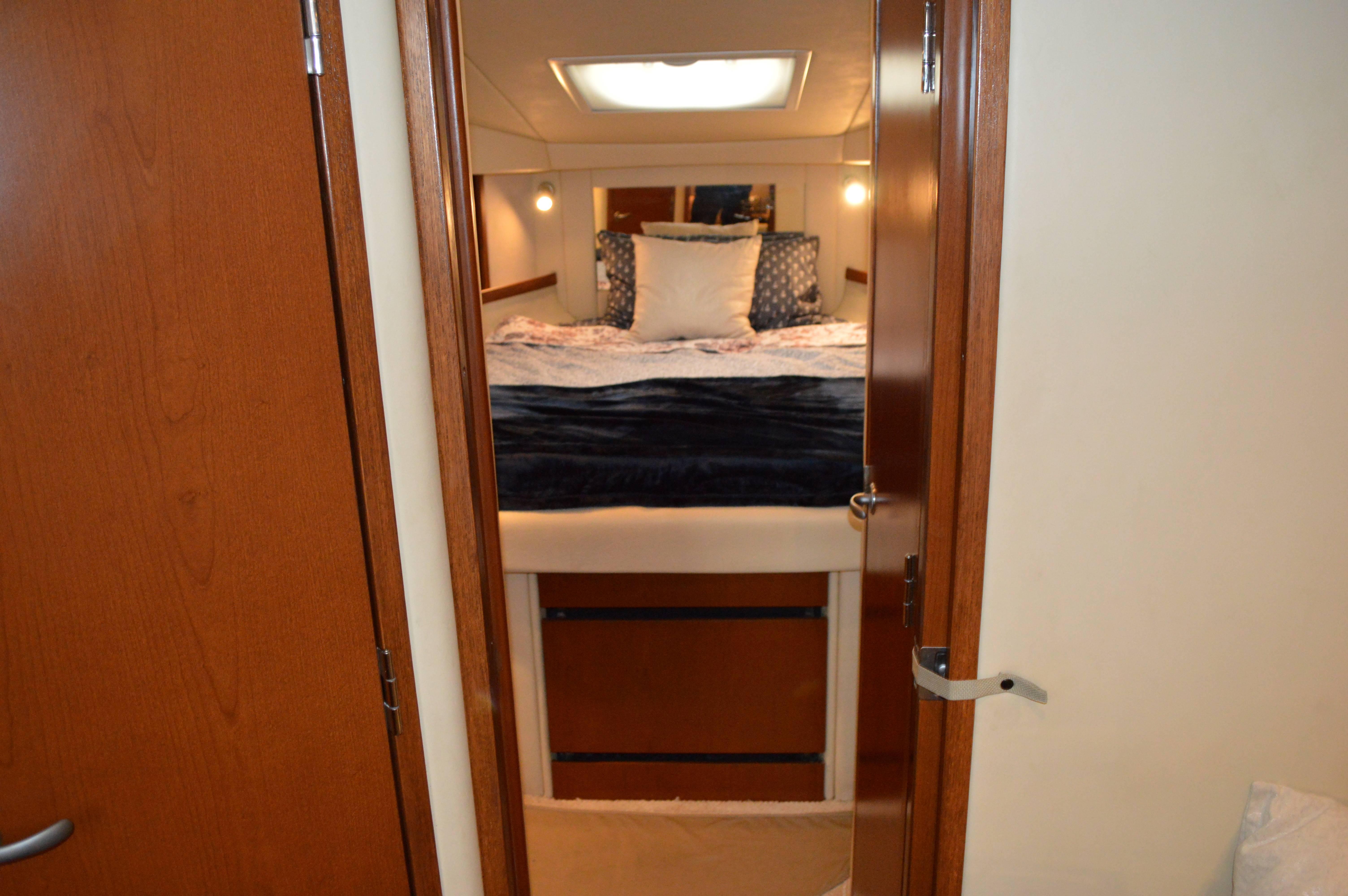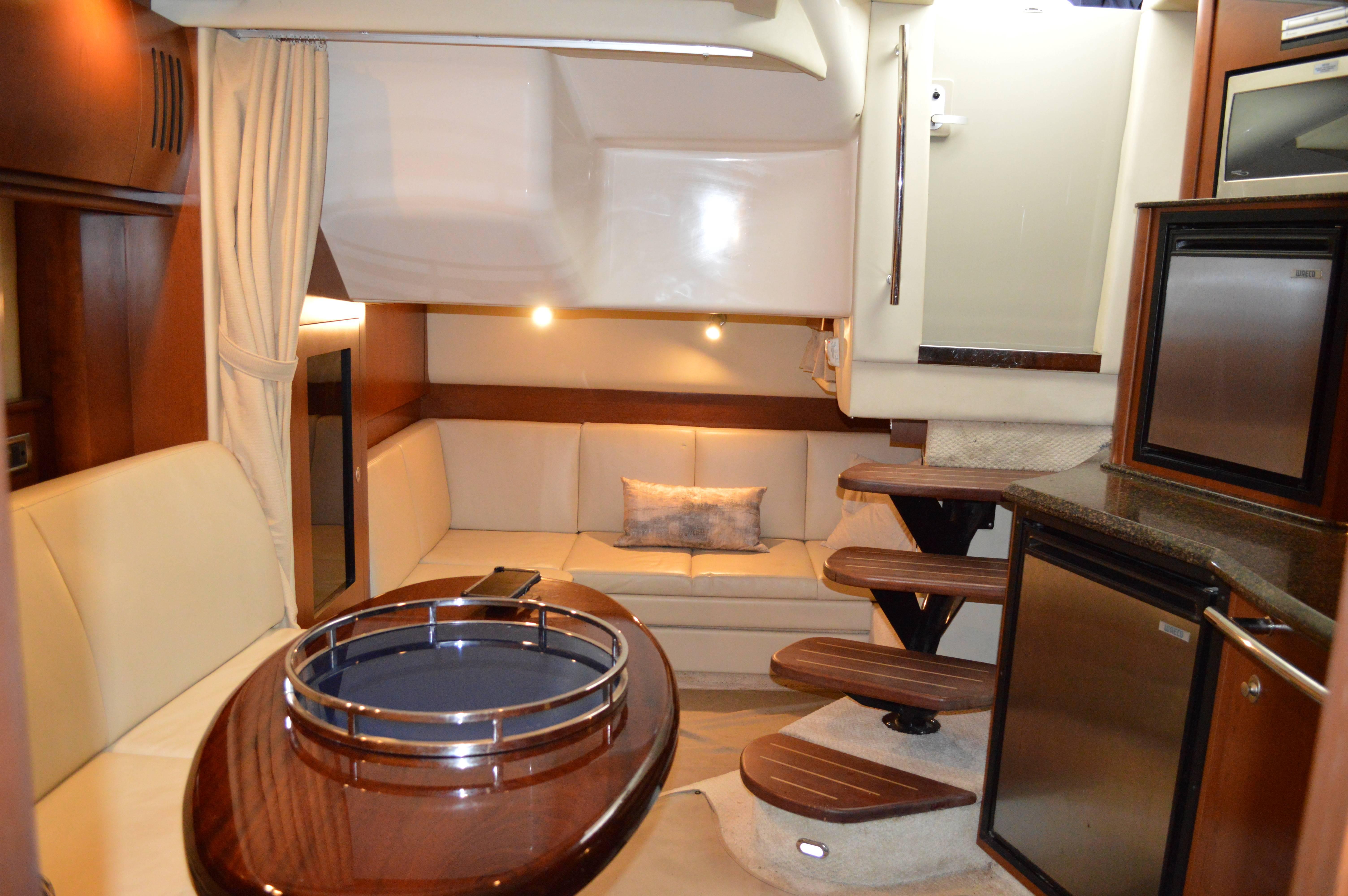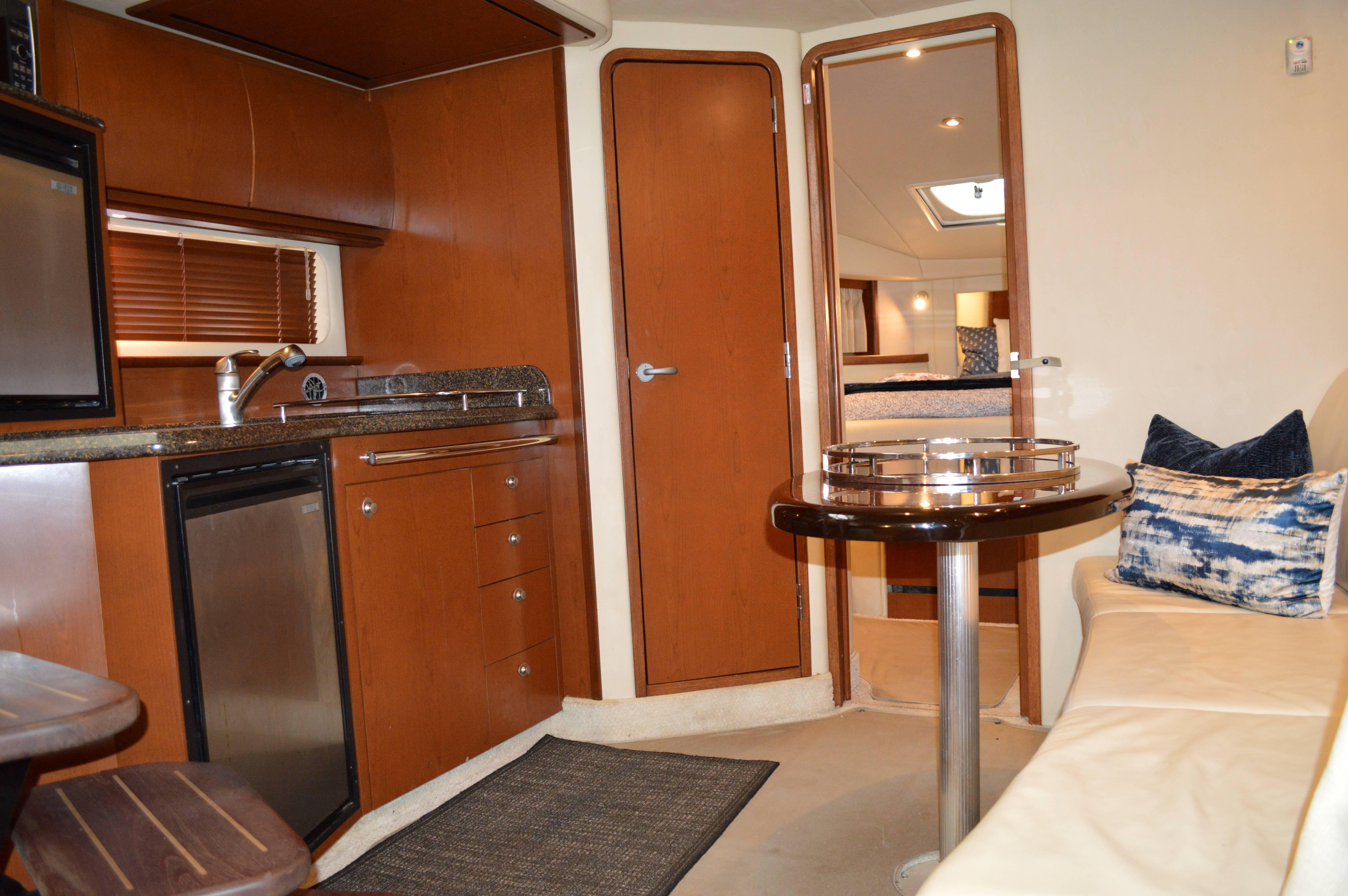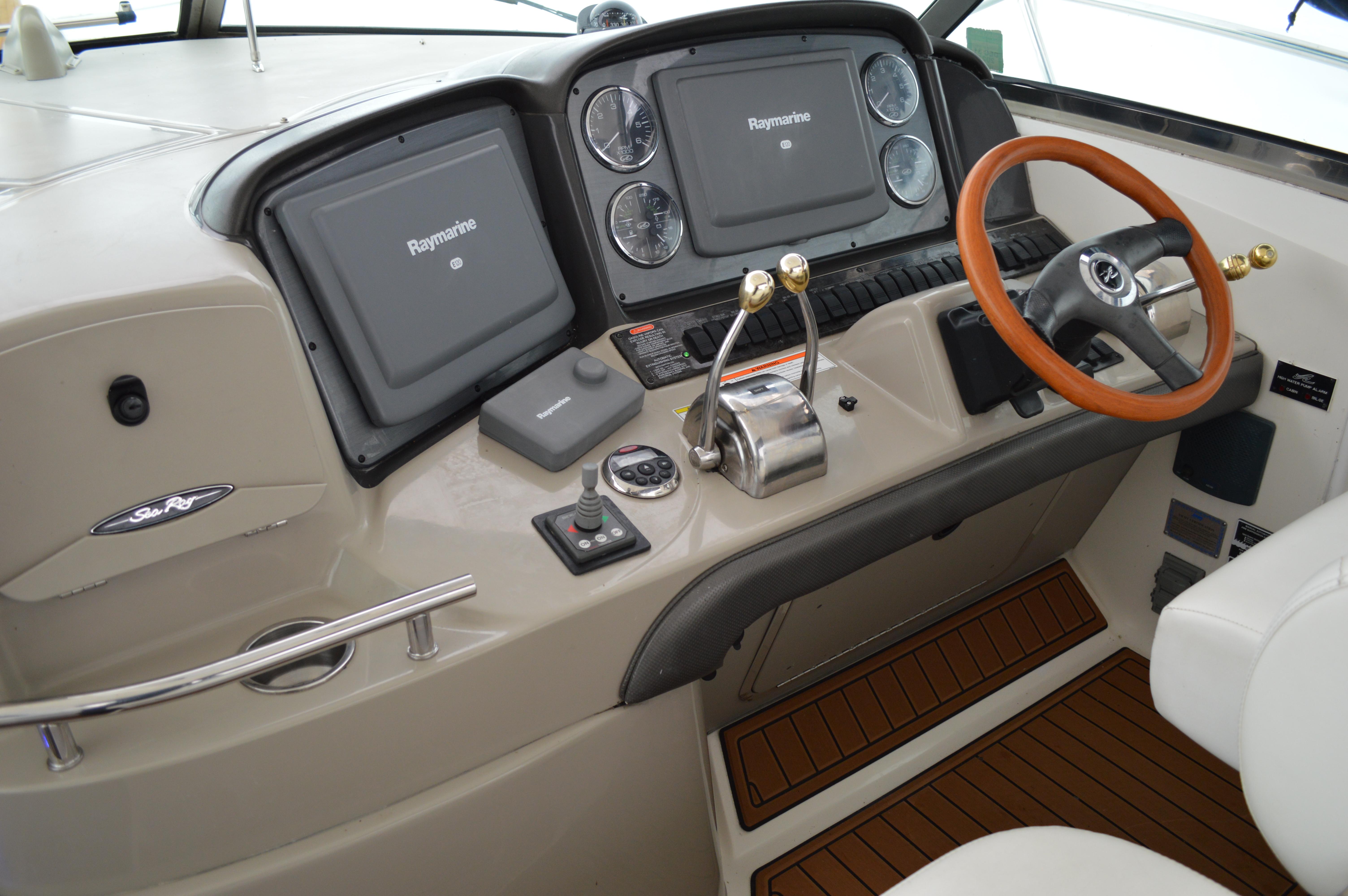 This exciting 38 Sundancer features a stylish fiberglass hardtop with aft sunshade, overhead lighting and stainless-steel grab rails. An innovative center door in the transom provides easy access to the luxuriously appointed cockpit, complete with Corian table top, wet bar and icemaker. Powered by twin 8.1 S Horizon MerCruiser V-drives. This Sport yacht offers underwater exhaust and standard anchor washdown.