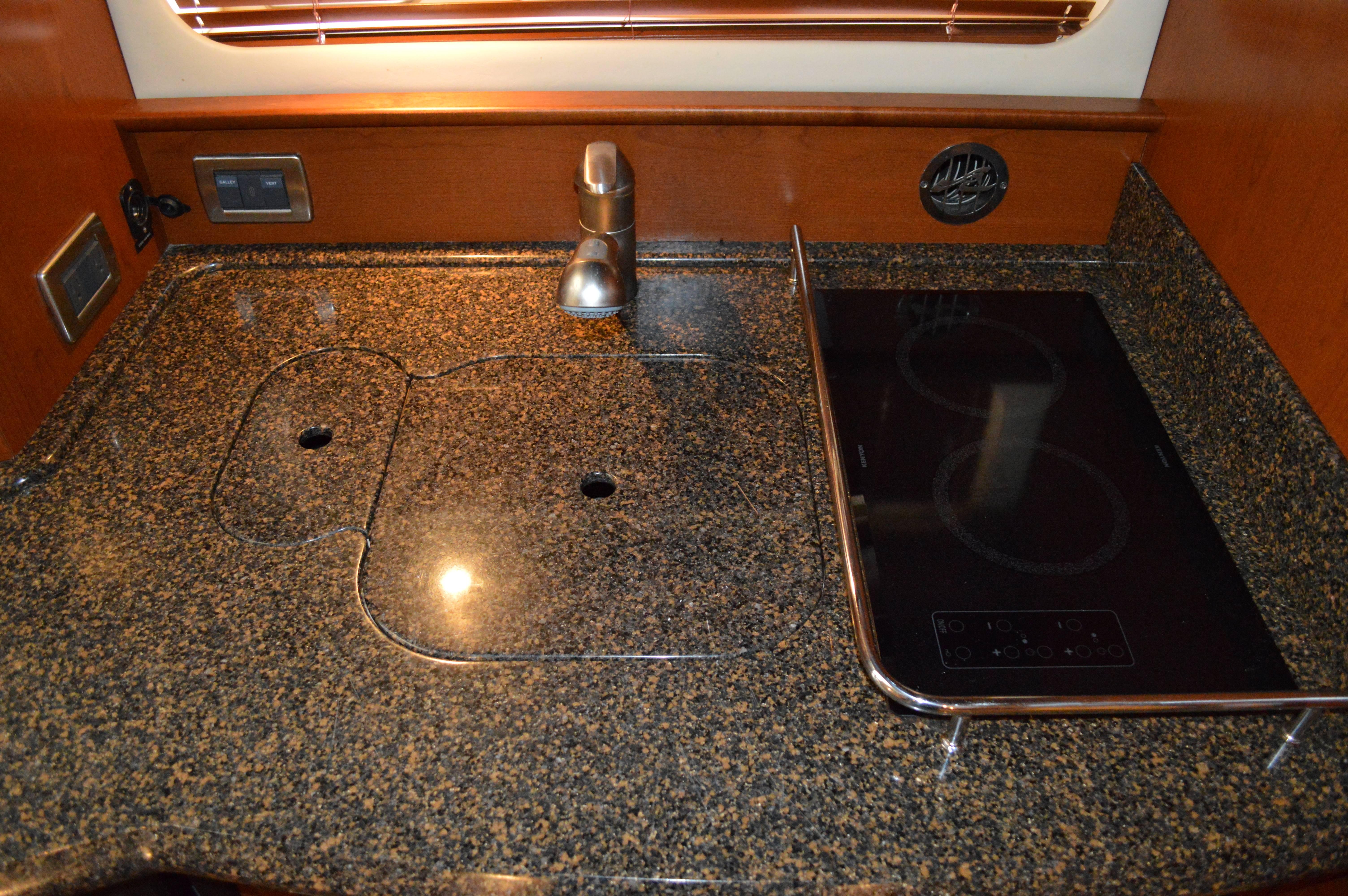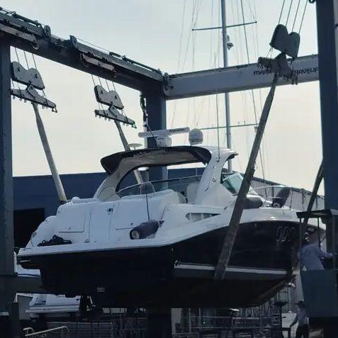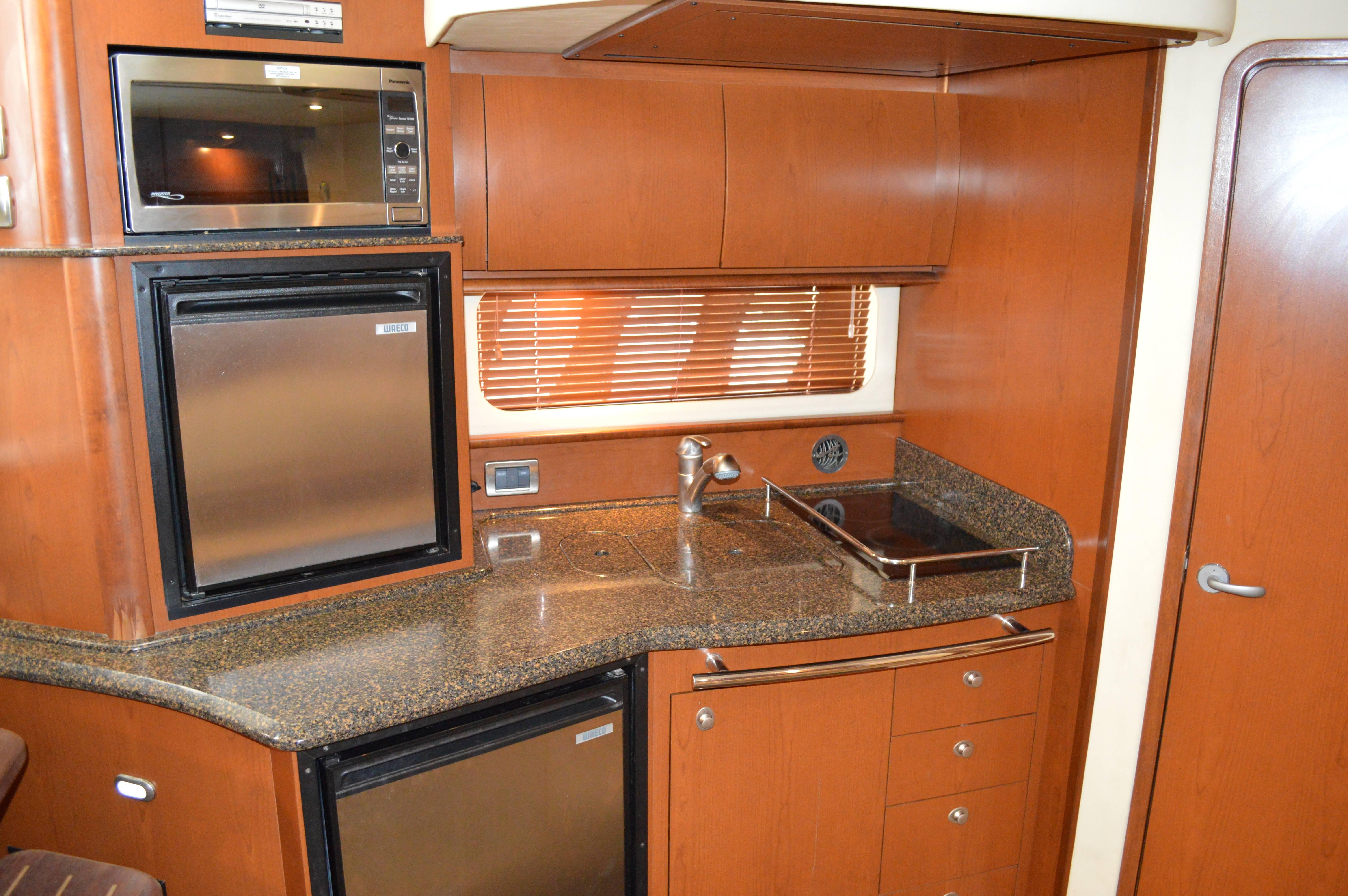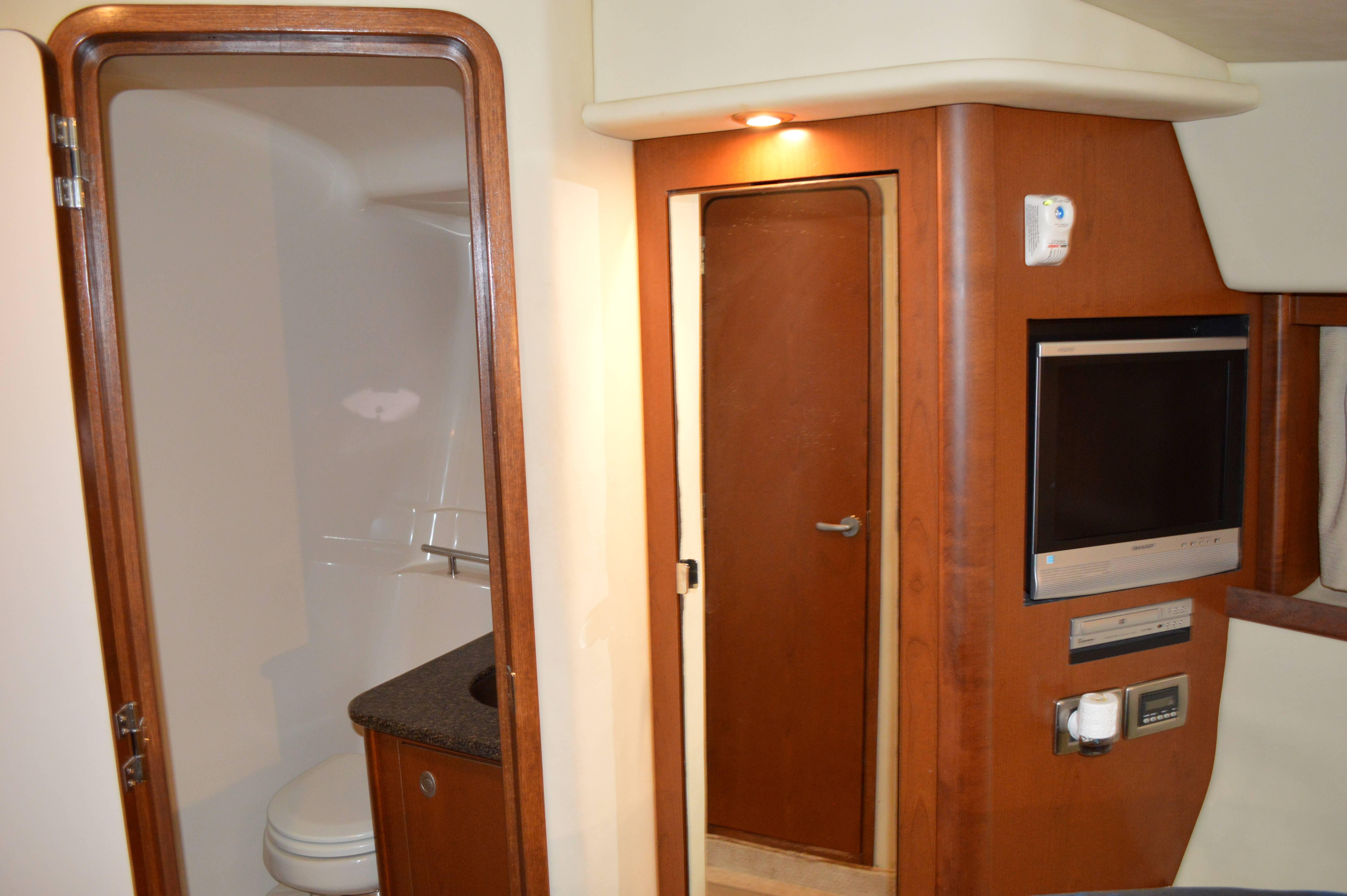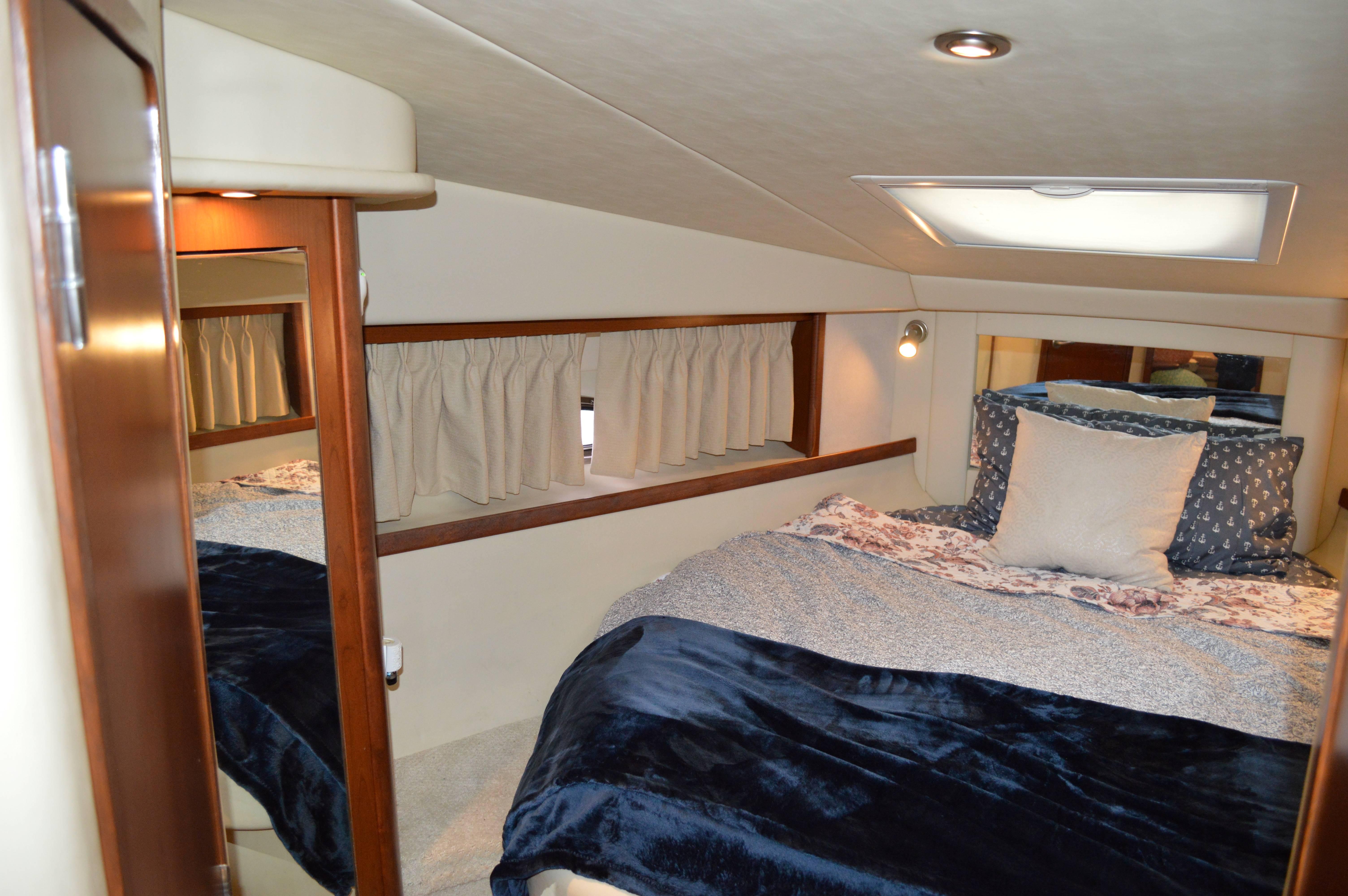 This exciting 38 Sundancer features a stylish fiberglass hardtop with aft sunshade, overhead lighting and stainless-steel grab rails. An innovative center door in the transom provides easy access to the luxuriously appointed cockpit, complete with Corian table top, wet bar and icemaker. Powered by twin 8.1 S Horizon MerCruiser V-drives. This Sport yacht offers underwater exhaust and standard anchor washdown.