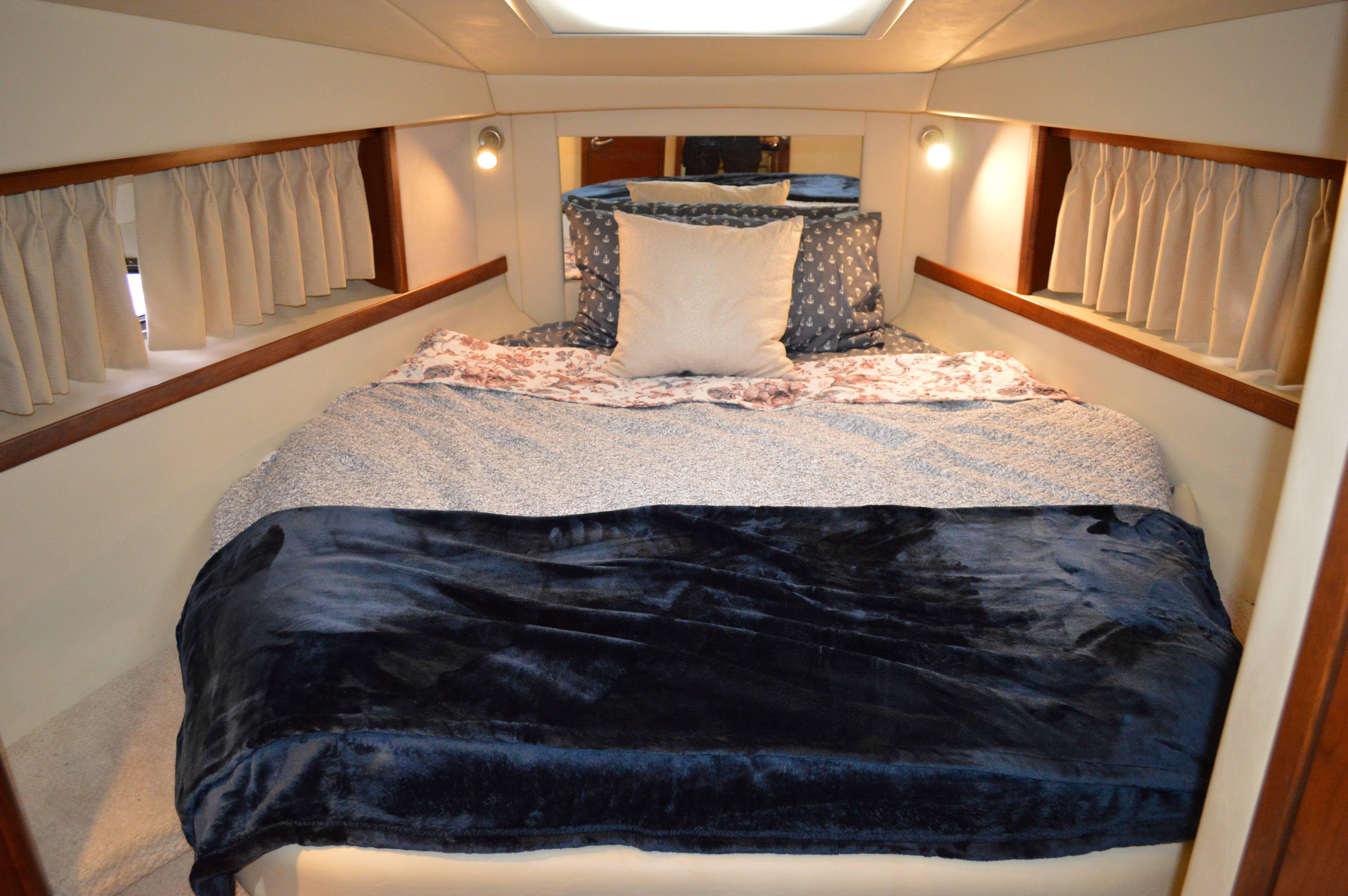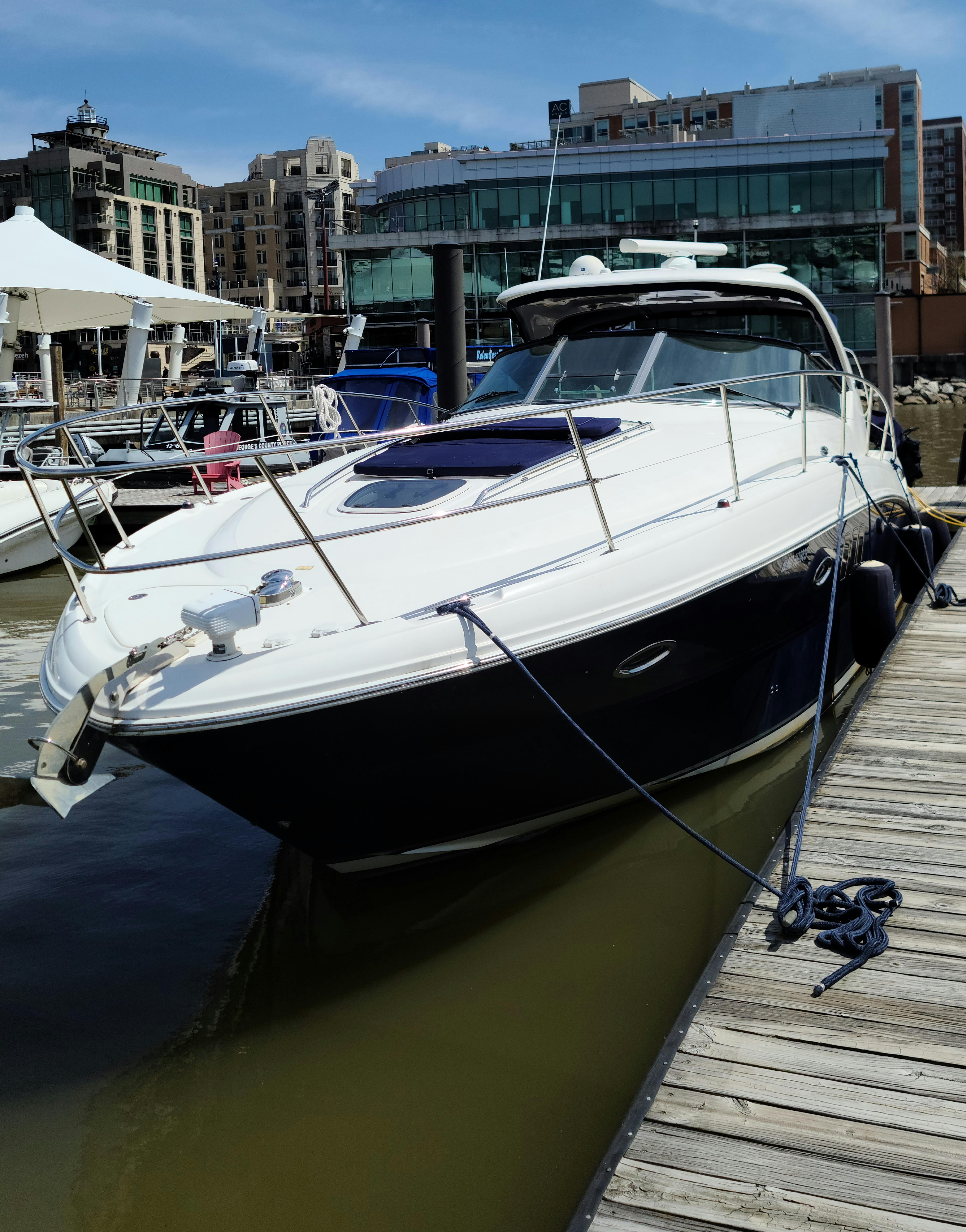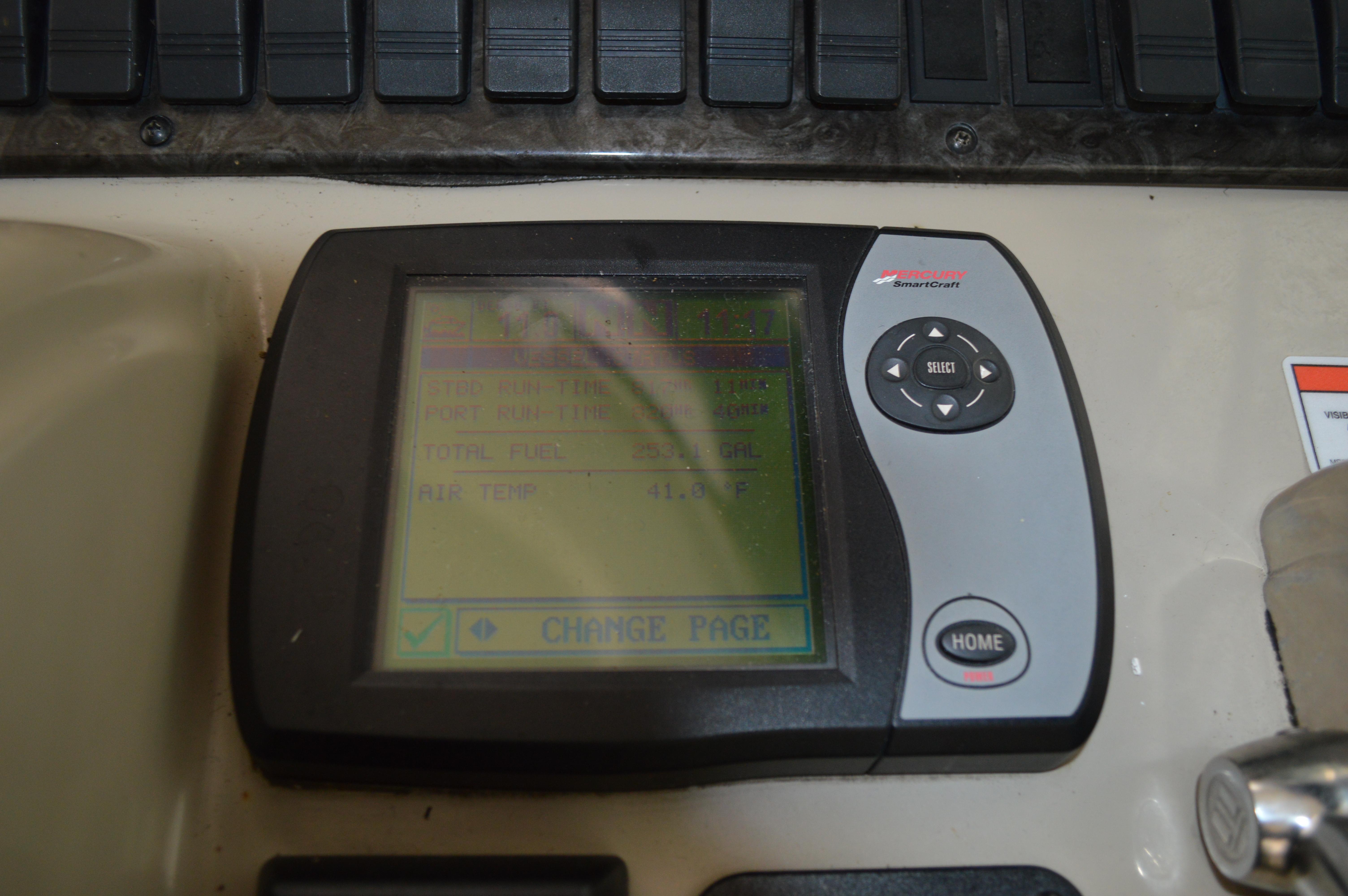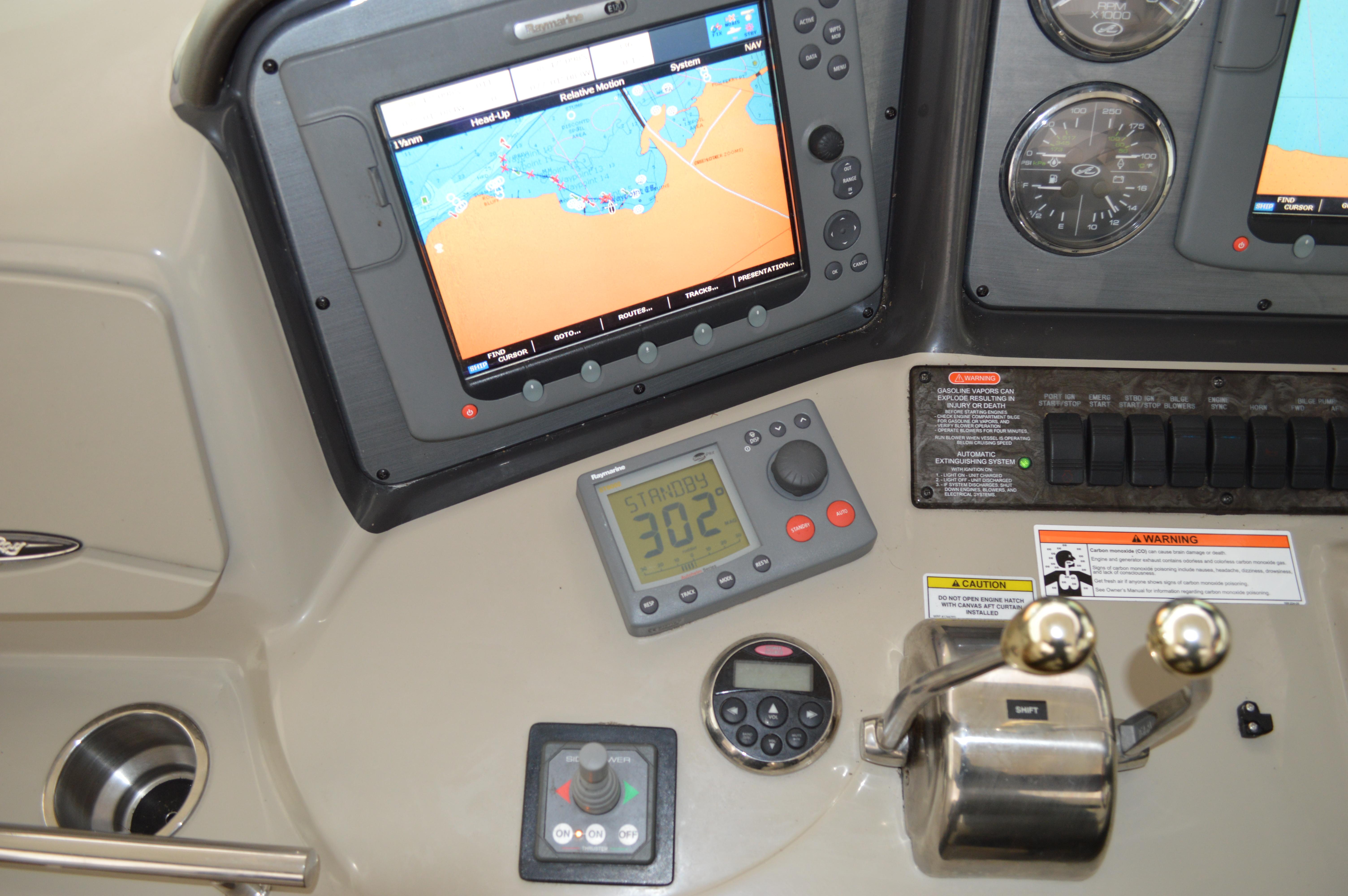 Powered by Mercury Marine MerCruiser Horizon 8.1 S SmartCraO DTS, 8.1 Liter and is equipped with Gen; Air; Bimini with Enclosure; Bow Thruster; Two (2) Raymarine E120 Radar, GPS, Depth; DSS; Upgrade Stereo; Cockpit Fridge; Sea Dek in Cockpit and on Swim Platform; Bow Sun Pads; Windlass; Cockpit TV; Cockpit Cover; Blue Hull.