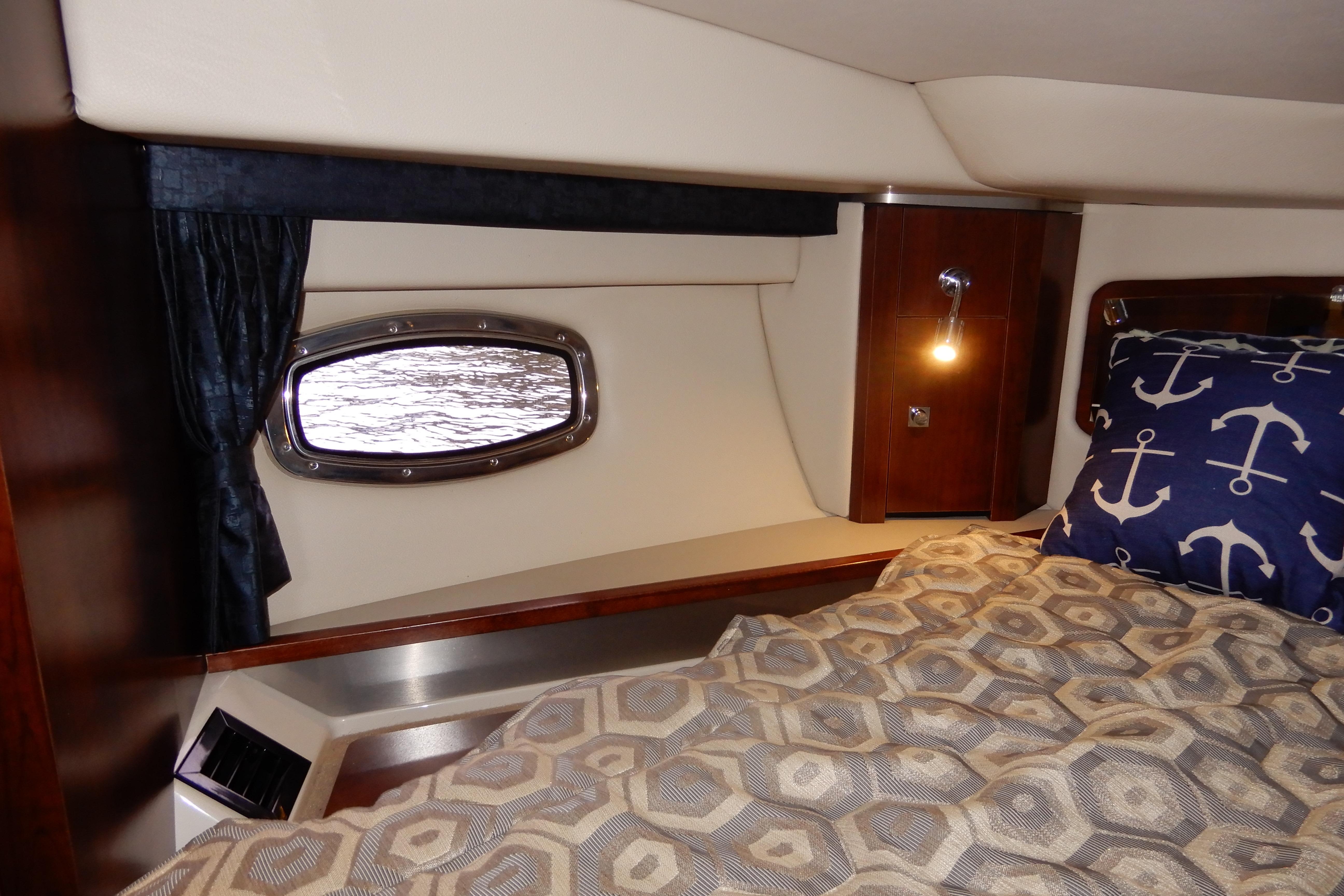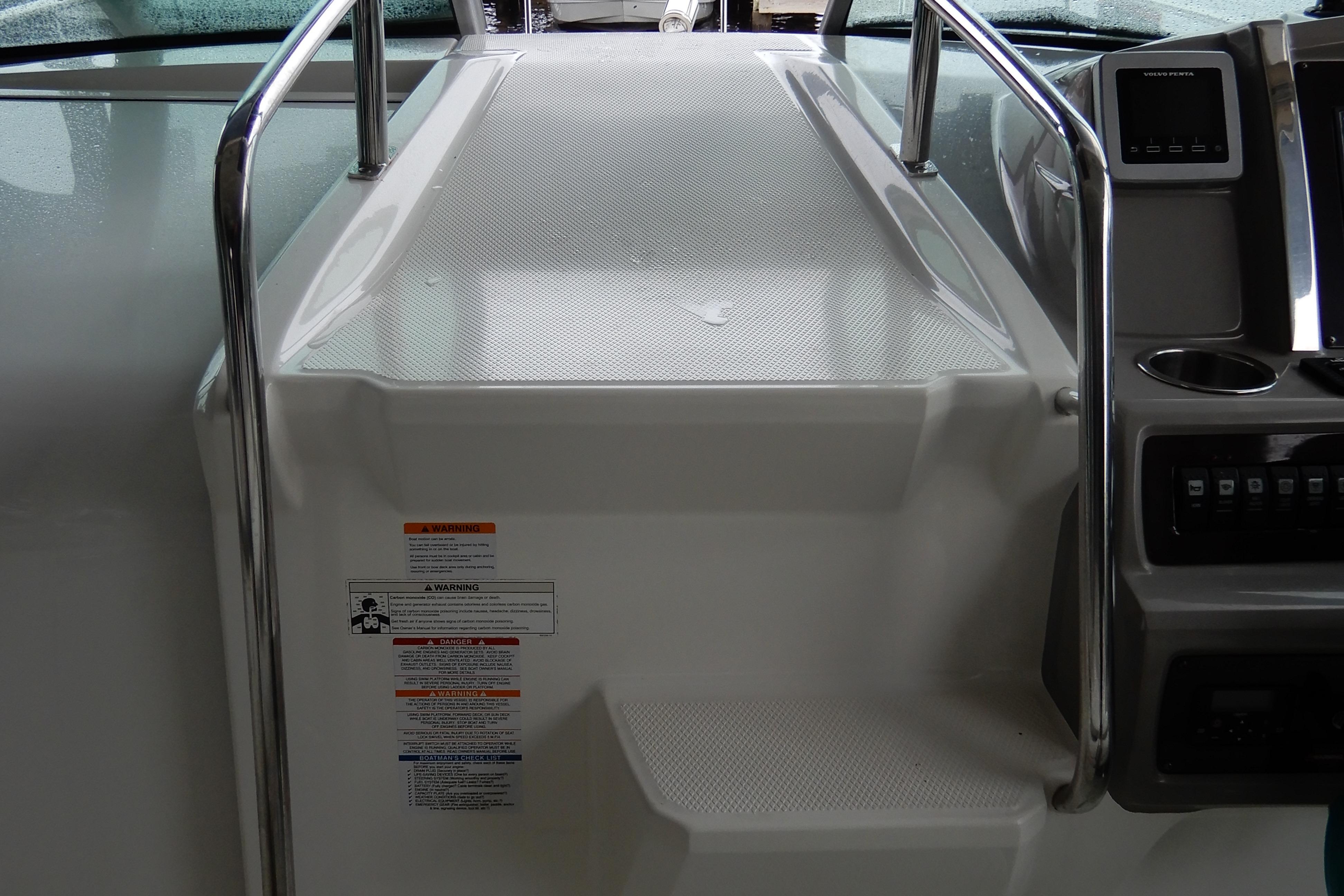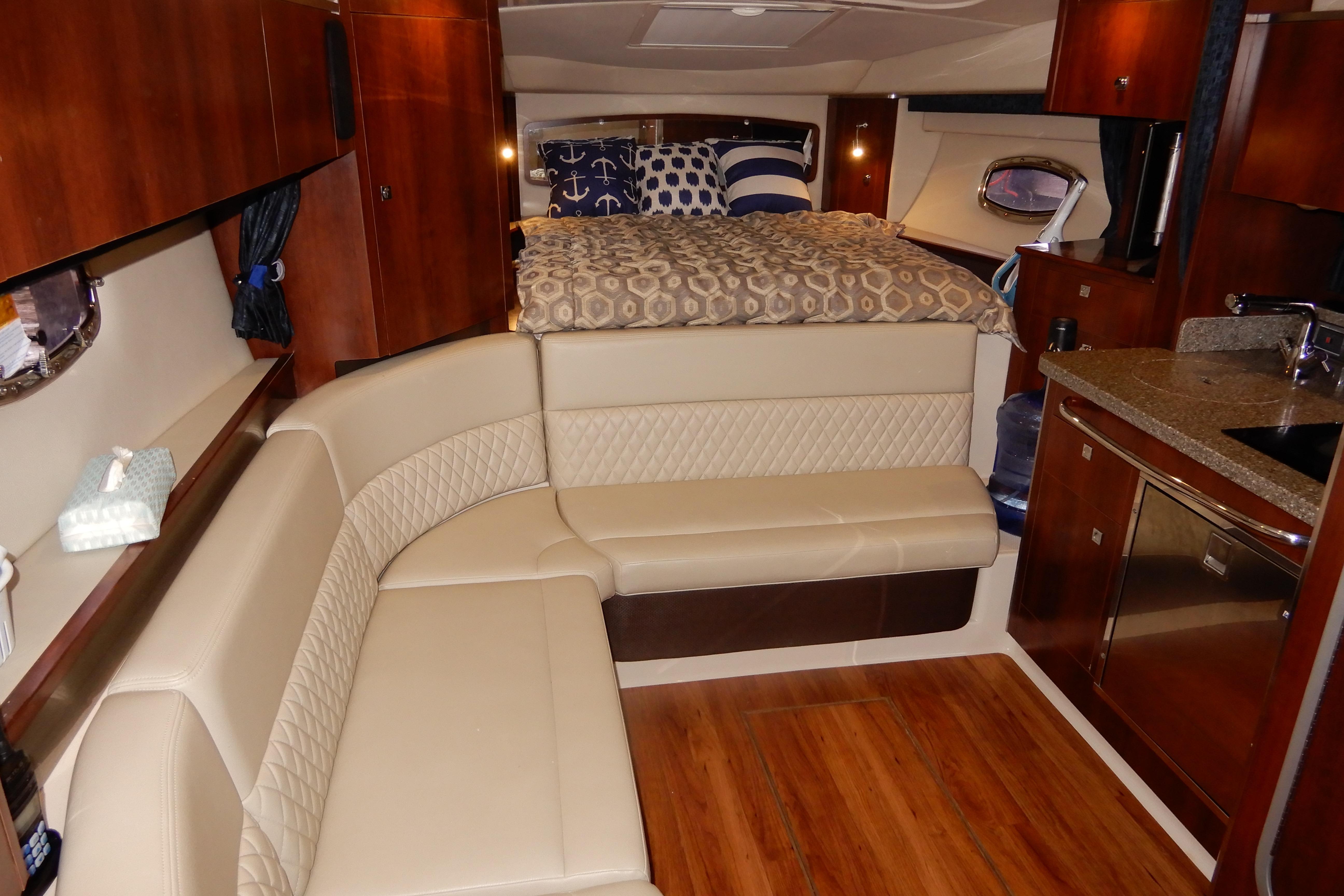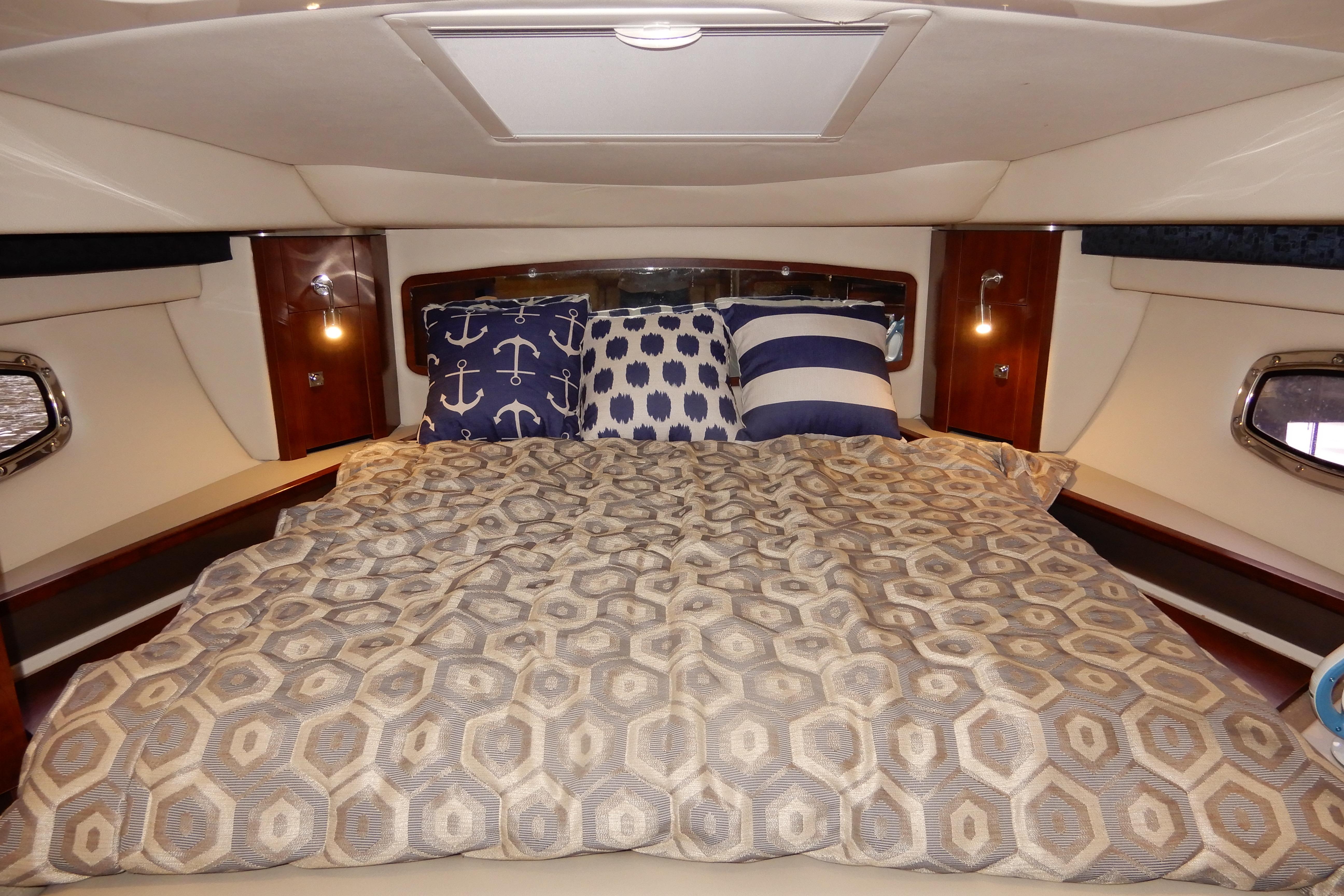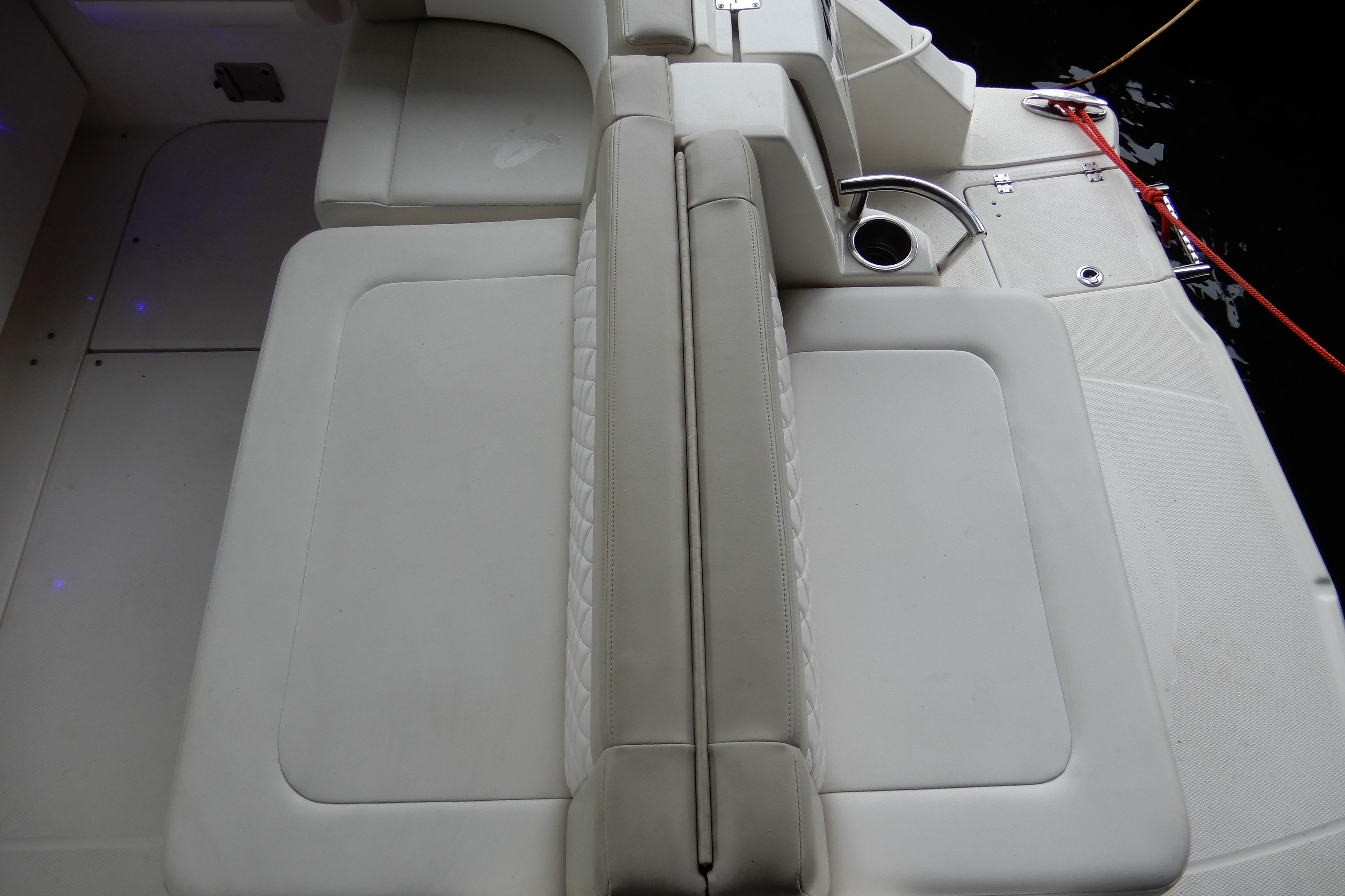 This spacious family cruiser, has ample seating on deck. Cockpit fridge, full camper canvas, at the helm there is GPS, Volvo digital gauges, joystick control and digital throttles. On deck, there is a windlass, and walk through windshield. In the cabin there are two separate sleeping areas, full head and full galley, AC/heat, and more.