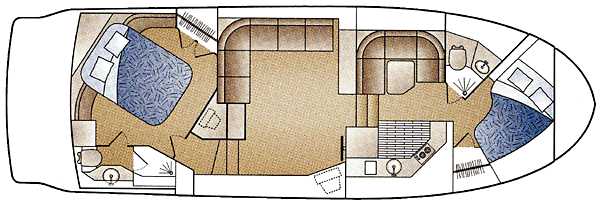 With more than 100 square feet of aft deck space, and the available aft deck wetbar, the Carver 406 Motor Yacht is well-optioned for fun in the sun. Fully equipped with the optional aft deck hardtop and arch, owners will notice there's plenty of room to roam topside. As roomy below as it is above, the 406's salon includes an L-shaped Flexsteel sofa with double incliners and a love seat. Aft, the 406 features a magnificent stateroom that includes an oversized queen berth, inner-spring mattress, abundant storage space, a large hanging locker and plenty of walk-around room. Add the convertible dinette, salon sofa bed, and a comfortable forward stateroom, and the 406 can easily accommodate a party of seven.