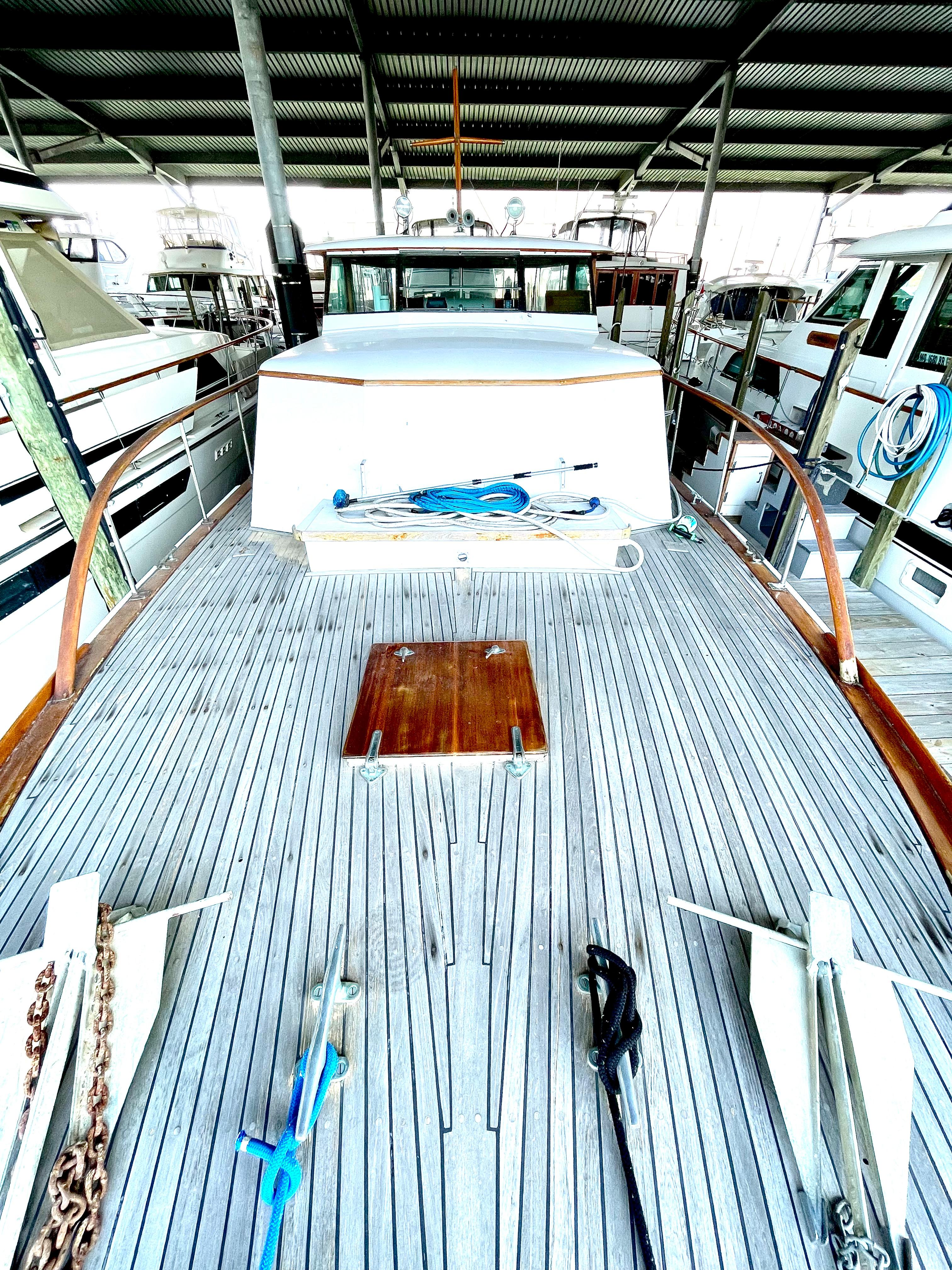 She is overall in sound condition, from 2015-2017 the hull was wooded and had any damaged planks replaced, followed by epoxy sealing, primer, and 4 coats of Interlux brightside polyurethane topcoat. At that time the exterior bright work was also refinished. In 2018 all portlights and helm glass were replaced. In the 1990's, a previous owner had the entire bottom planking removed, all damaged framework was repaired followed by a double planked mahogany per original construction. This was followed by a 3/8th inch marine plywood sheathing and then glassed over creating a composite. She is powered by 2 GM Diesel 671 Natural. A full interior modernization was begun in 2018 and partially completed. There are 2 new electric heads onboard and ready to be installed. Need to purchase holding tanks. There is also 2 new reverse cycle heat/air units that are in place and need hook up. Custom furniture, pillows and Sunbrella cushions all fabricated and some already onboard. Master stateroom has been completely stripped of paint with bedrails, locker doors, dresser and entry door stripped, and restored to their original varnished mahogany. The aft deck has all of its original Trumpy furniture that has also been recently refinished with Epifanes and fitted with new Sunbrella cushions and pillows. The aft deck eisenglaas was replaced in 2017. The electrical system was all replaced and upgraded.